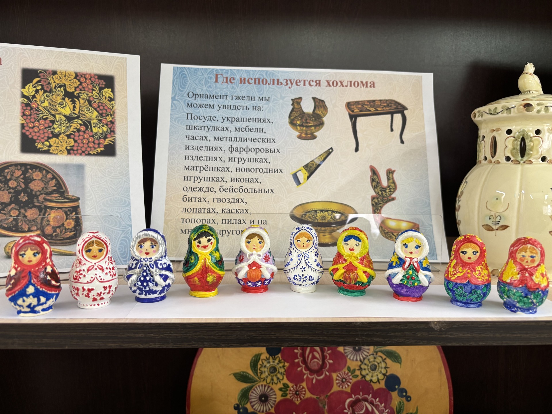 В работе были использованы гипсовые заготовки, которые превратились в оригинальные изделия с неповторим рисунком в национальной расцветки народов России. Готовые изделия заняли достойное место на книжной выставке «Русские народные орнаменты и росписи».