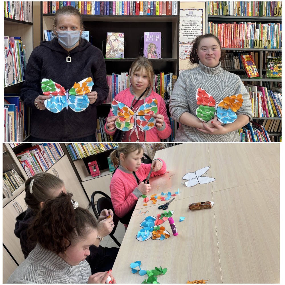 В библиотеке прошло очередное занятие инклюзивного кружка «От сердца к сердцу». Участники создавали бумажные аппликации. Каждый сделал объемную бабочку из маленьких сердечек. Одна участница выбрала для каждого крылышка свой цвет, а другие сделали бабочку разноцветной. Каждый из присутствующих решил, кому подарить свою поделку, кто-то маме, кто-то бабушке.